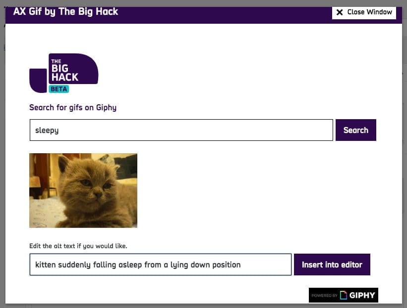 We spoke to Harry Hurd at Clear Honest Design, who developed a WordPress plugin to help. It allows users to add custom alt-tags to GIFs from the GIPHY database; an accessible GIF tool.