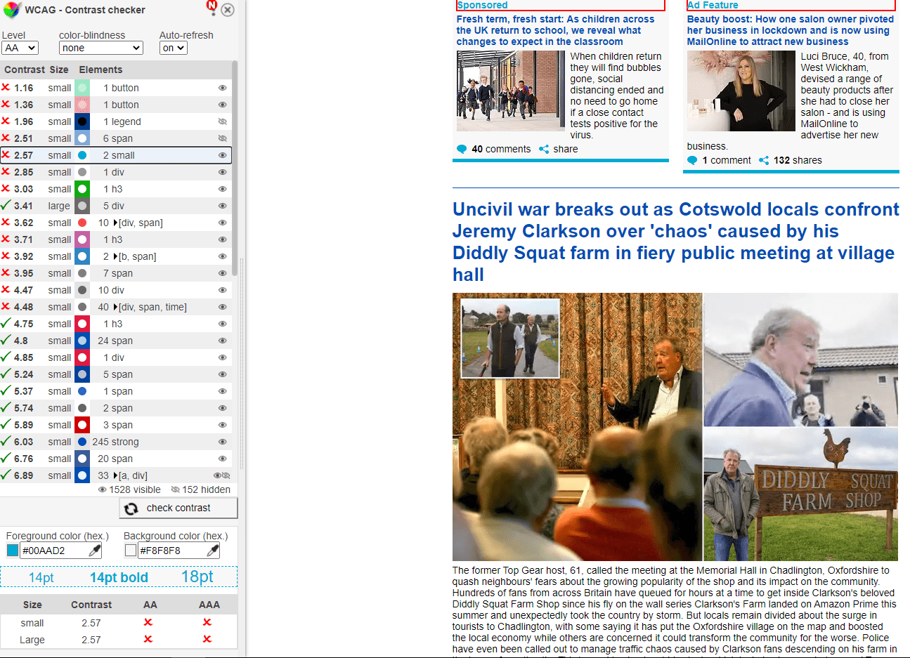This browser extension checks the colour contrast of elements on an existing webpage. It lists all the colours, their contrast ratio, and if they are compliant.
