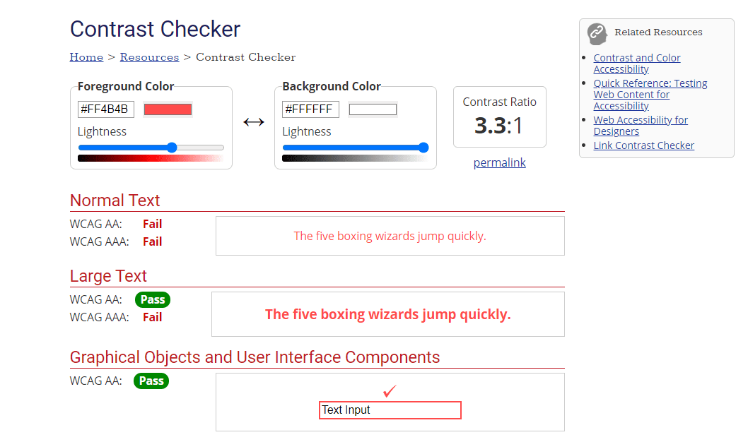 Please note, this tool only checks contrast 4.5:1 for normal text. It does not check contrast of 3:1 for large text and graphical objects.